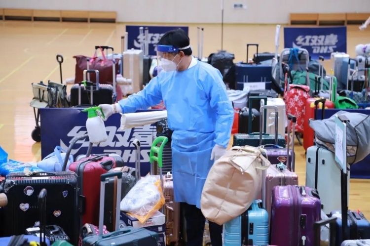 上中东校的体育馆、图书馆、龙门楼大厅里,志愿者教师和后勤工作人员做好师生行李的登记、消杀、静置工作。