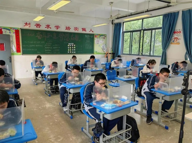 上海市黄楼中学定制了隔离挡板,学生单人单桌用餐。