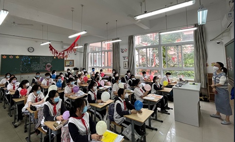 开学第一课上,进才中学东校不仅举行了升旗仪式,还特别组织了学生情感联结的团建活动。初三学生人手一个彩色气球,在老师的引导下渐渐看见内心的情绪,并通过冥想活动和 “54321法”,让心安静下来。