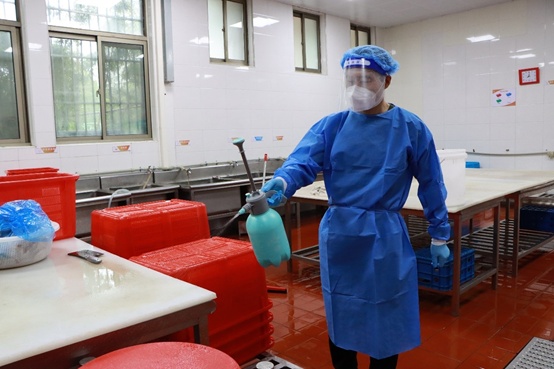 上海市建平西校的后勤工作人员,做好食堂消毒工作。