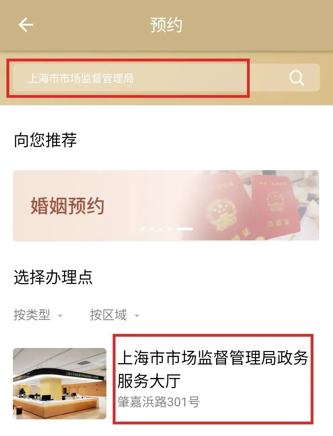 2.跳转至预约界面,搜索——上海市市场监督管理局,选择上海市市场监督管理局政务服务大厅。