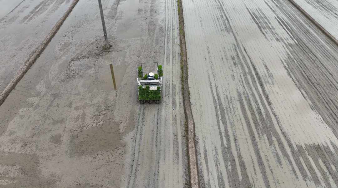 在枫泾镇卫星村,待播种的稻田波光粼粼。种粮大户毛良云承包的稻田里,田间地头一片忙碌。伴随着阵阵轰鸣,3台插秧机“火力全开”,将秧苗整齐地插进肥沃的泥土中。不到2小时,一整块水田就换上“新装”,秧苗吐翠,呈现一派生机盎然的景象。