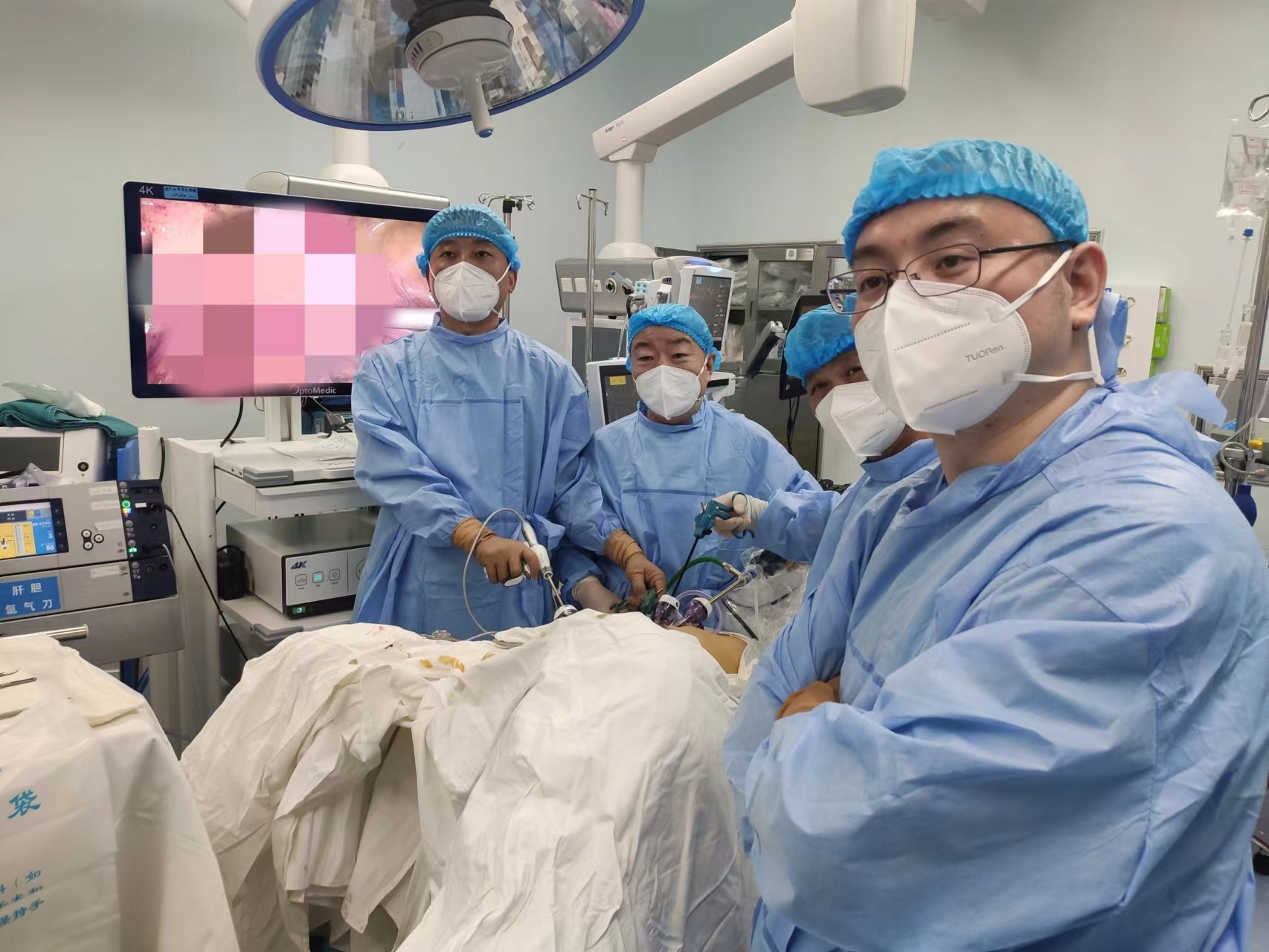 5月26日,手术采用了团队接力的方式开展,先由科室里经验丰富的周波主任干净利落地完成“腹腔镜结肠癌切除”,随后李俊主任通过“鞘外阻断右后叶肝蒂”“ICG荧光反向染色”和“术中超声定位”等巧妙的“连环计”,既完整、精准的切除了肝肿瘤,保证了肿瘤的安全切缘,又避免了损伤肝脏周边的大血管。奋战3个多小时后,手术顺利结束。