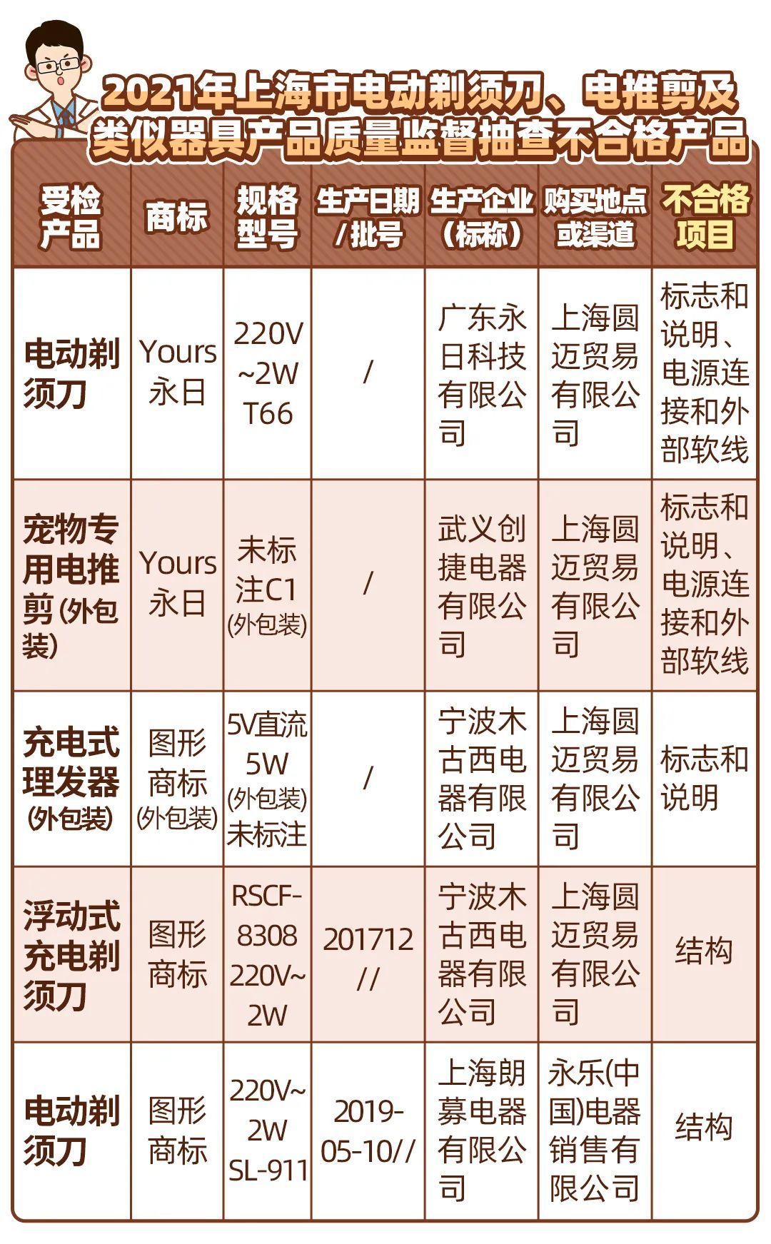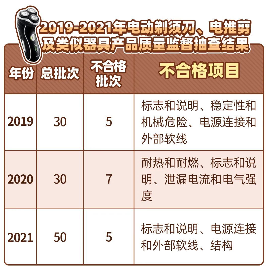 从连续三年跟踪抽查的数据来看,电动剃须刀产品的质量安全问题主要集中在标志和说明、电源连接和外部软线、结构上。