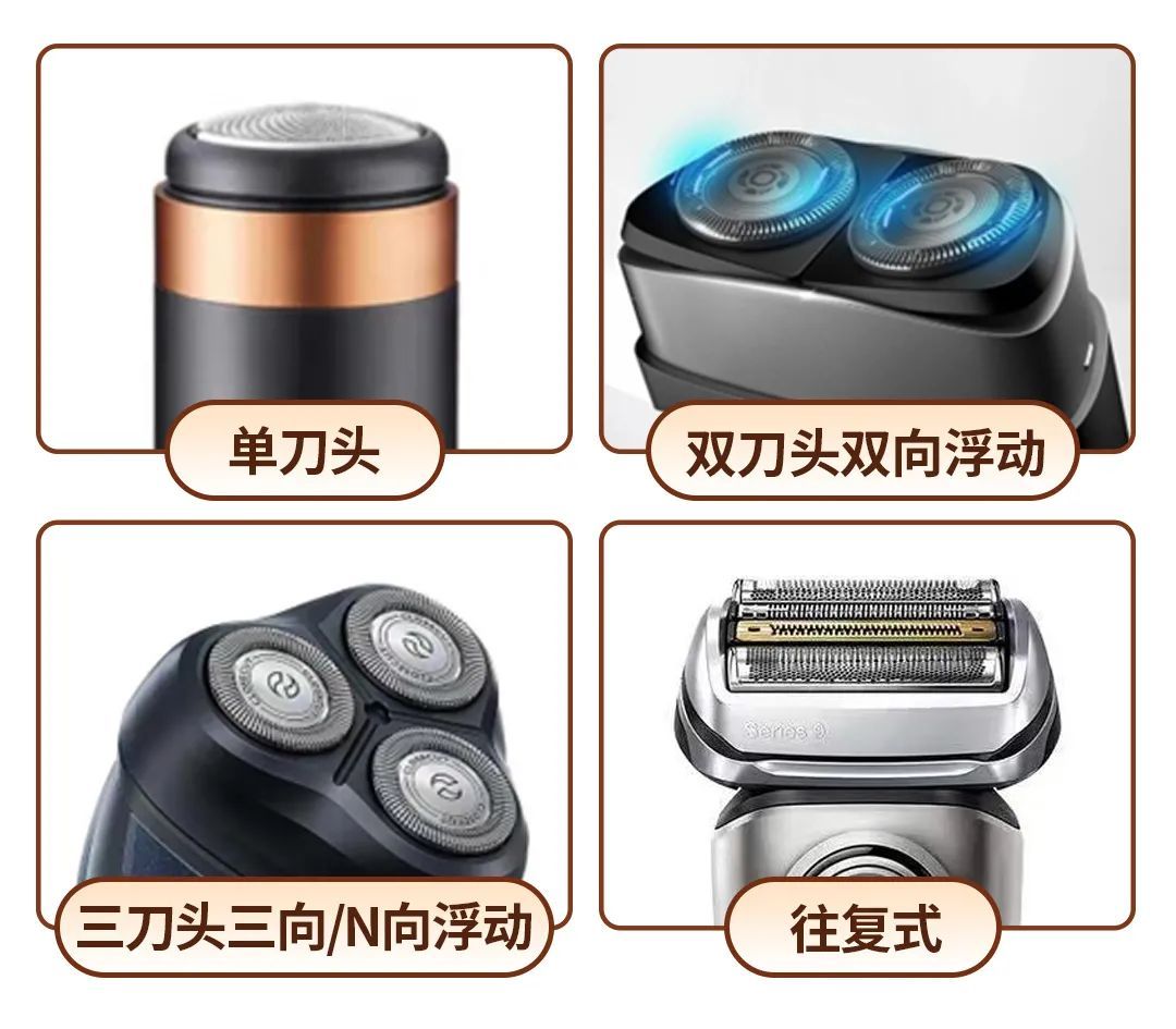 旋转式剃须刀的浮动向较多,贴合度越高,适合较短的胡须;往复式剃须刀刀头大多呈现一字型,工作时进行左右直线运动,适合相对长的胡须。