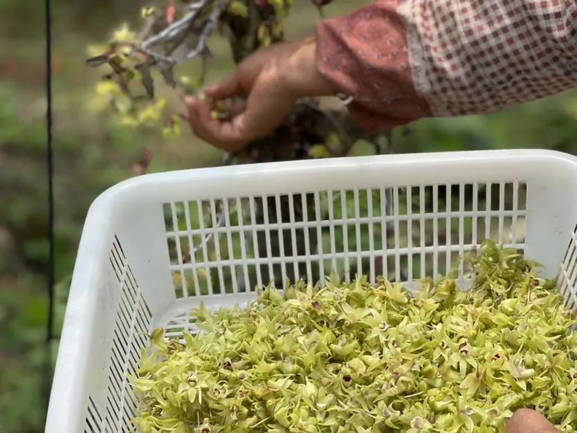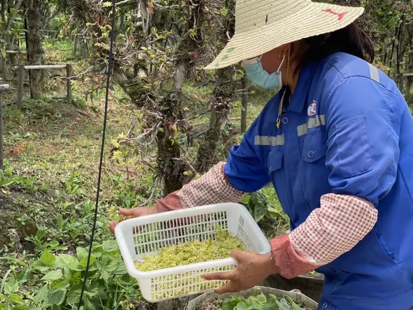 据了解,新陆村林下经济实验基地的露天石斛培育了将近五年,今年是第一年可以采摘石斛花,石斛花的功用与石斛相似,但是鲜花的吃法却别具新意——新鲜石斛花可以凉拌菜品上餐桌。或者说可以把它烘干之后,当做一种茶叶来泡制。