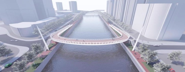 安远路桥梁景观设计方案是从向公众征集的众多优秀方案中精选而出,其桥体形成一个很有特色的C形形态,漂浮于苏州河上空,设计突出了人文休闲的苏州河文化,呈现了两岸城区的风貌形象,形成了两岸协调发展的重要纽带。