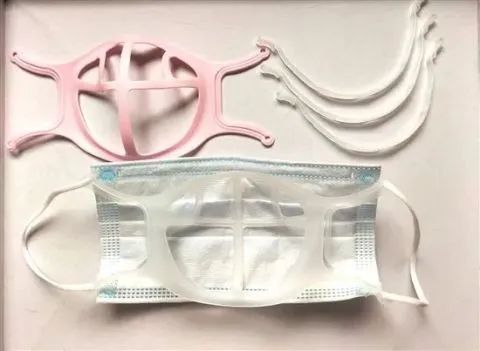 “口罩支架”:塑料或硅胶制成,使用时将其固定在口罩内侧,让人脸和口罩之间保持一定距离。这个作用主要吸引化妆的消费者,广告语频繁提及戴上可“不沾口红、不脱妆”等。