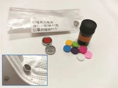 “口罩香薰扣”的扣子实为磁铁,前后均呈镂空状,产品附有若干枚小绵片及精油,将扣子扭开后放置滴入精油的棉片,即可发挥功效。