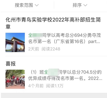 2020年8月,湛江日报和湛江市北大附属实验学校公开发布关于湛江市北大附属实验学校学生全某某考上北大的消息。在湛江市北大附属实验学校的官方微信公众号中,全某某还通过视频分享了自己的学习经验。