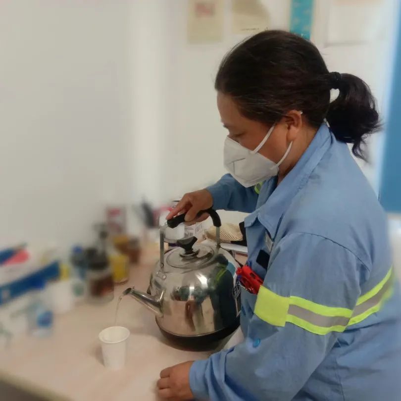 同时,各班组每日准备足量大麦茶,班组长及时将盐汽水分发至各岗位,关心了解一线职工,防止中暑现象发生。