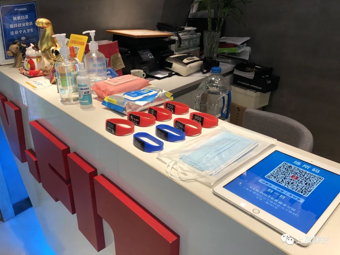 根据体育场所疫情防控指引,该健身空间在门口张贴“场所码”,工作人员核验顾客72小时内核酸检测阴性证明,测量体温无异常(<37.3℃),方可进入锻炼。