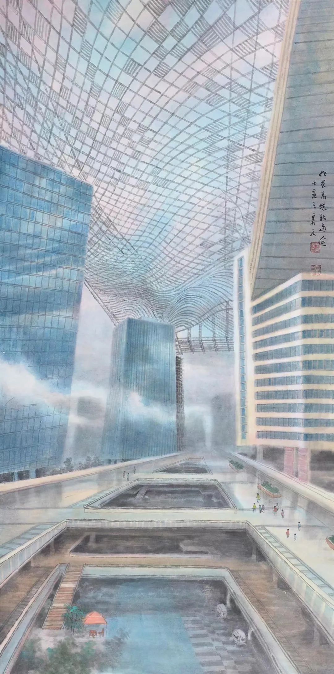 “我画画有个特点,不喜欢打稿。”乐震文说,铅笔打下的稿线限制了后续落笔。为此,他在作画前总是“深思熟虑”。《化茧为蝶新通途》作为乐震文用国画技法绘现代建筑的首作,凝聚了其颇多心血。宽68厘米、长130厘米的这一画作,乐震文全神贯注一气呵成。作品透视准确,建筑立体感颇强。云廊引领视线,由近及远直至消失,富有延伸感。最难得的是,画作上方的网格错综复杂、线条不规则,乐震文脱稿而画却不显杂乱,绘画功底可见一斑。