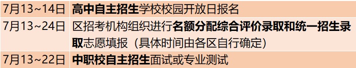 | 7月24~25日 | 高中学校组织自主招生综合测试(含市级优秀体育学生、艺术骨干学生和国际课程班自主招生) |