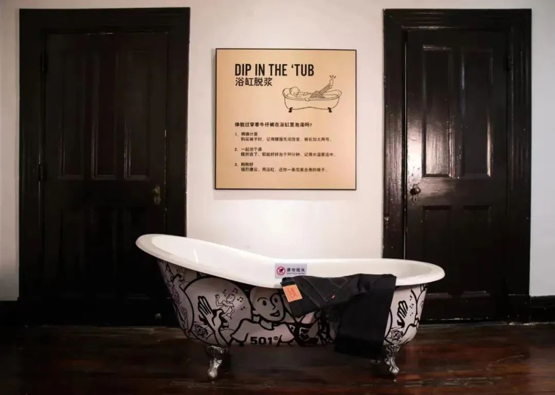 店铺二层是“养牛秩闻博物馆”。“养牛”是丹宁爱好者的“术语”,“牛”代指牛仔制品,“养”意为穿着、洗涤、摩擦牛仔制品时的种种过程。在“博物馆”内,洗衣机穿上了“牛仔外套”,浴缸被搬到现场,现场教学“养牛”过程。