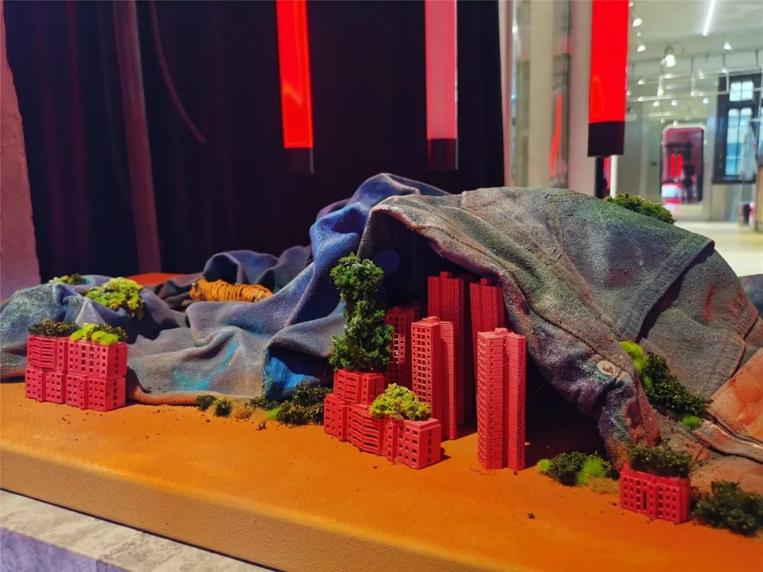 店内“C位”是名为“牛仔山水”的艺术作品,由画家、插画师谭轩创作。他将501®与中国传统文化结合,用牛仔裤纹理褶皱打造山水长卷,小房瓦舍置换成了林立高楼,明艳配色代入虚拟幻境,呈现了古今与中西两个时代与两种文化的交融。