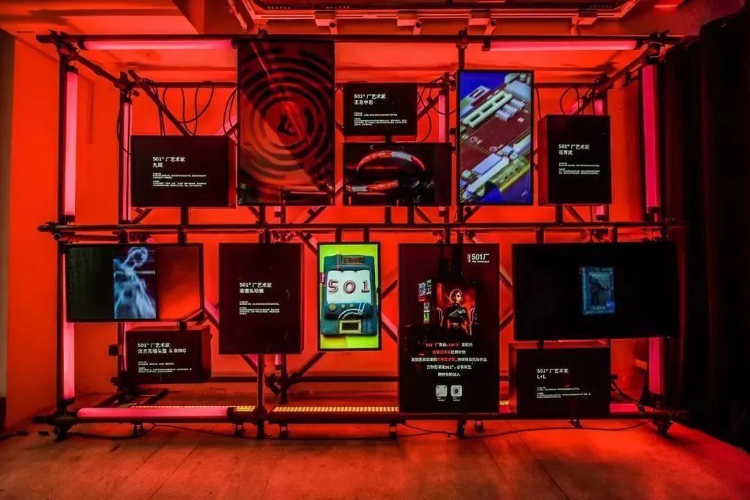 一层左侧放置着数个LED大屏,使店铺氛围充满艺术感和冲击力,屏幕循环播放着数字艺术。概念设计师、动态导演“花青虎”通过程序语言的数字视觉化表达,探讨规律的诞生和生命的可能。定格动画艺术家“茶壶头”用粘土制成美国西部牛仔时代的视觉符号,诠释出一种文化从无到有,不断演化的强烈生命力。
