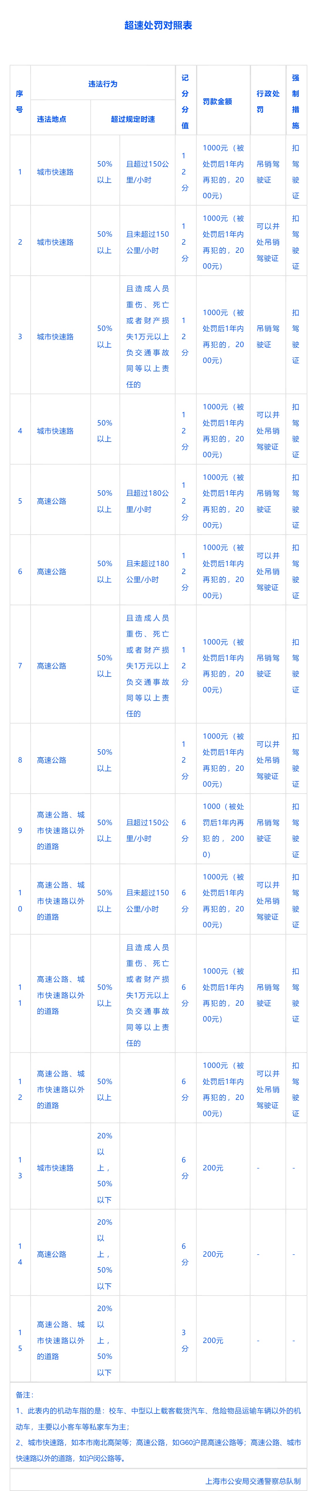 市公安局交警总队提示,开车要严格按照规定车速,保持安全车速和安全车距,严防发生追尾等交通事故。根据相关规定,对于校车、中型以上载客载货汽车、危险物品运输车辆以外的机动车,主要以小客车为主的私家车超速,可以对照下列《超速处罚对照表》。详见↓