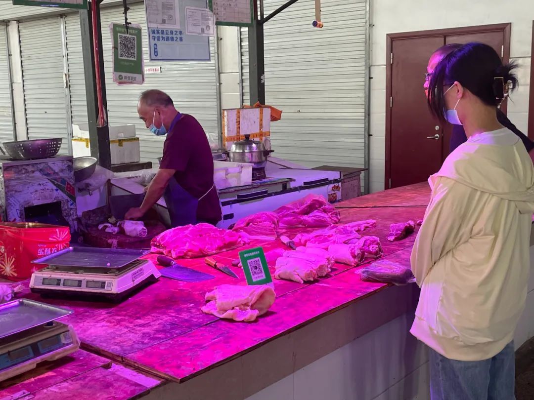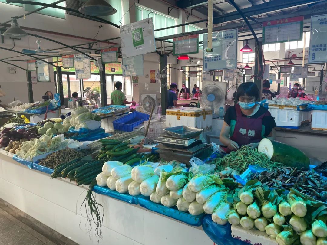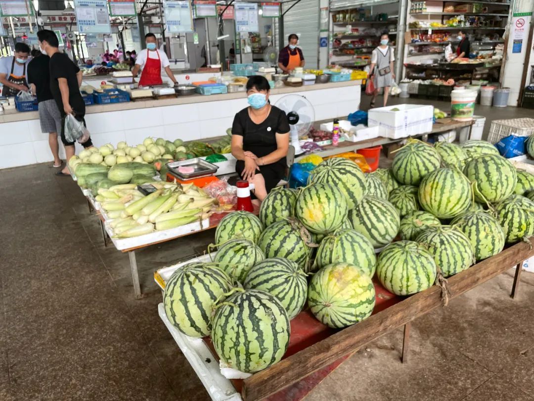 一旁的猪肉摊位上,五花肉、小排、蹄髈、猪脚等种类丰富。水果摊位上,香气诱人的甜瓜、解暑必备的西瓜等也大量上市,一个个色泽饱满,让人垂涎欲滴。前往市场买菜的市民表示,现在基本上最多买两天的菜量,菜价也很合理。