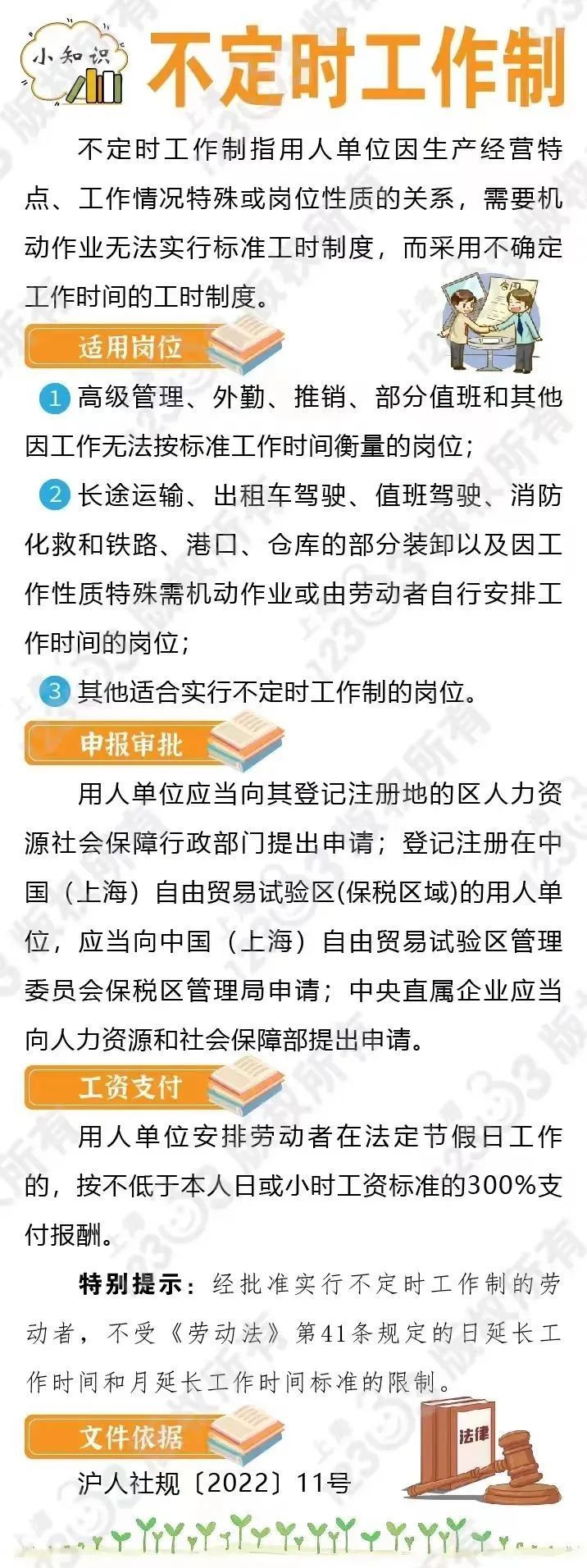 不定时工作制是什么?市人社局介绍,不定时工作制指用人单位因生产经营特点、工作情况特殊或岗位性质的关系,需要机动作业无法实行标准工时制度,而采用不确定工作时间的工时制度。用人单位安排劳动者在法定节假日工作的,按不低于本人日或小时工资标准的300%支付报酬。详见↓