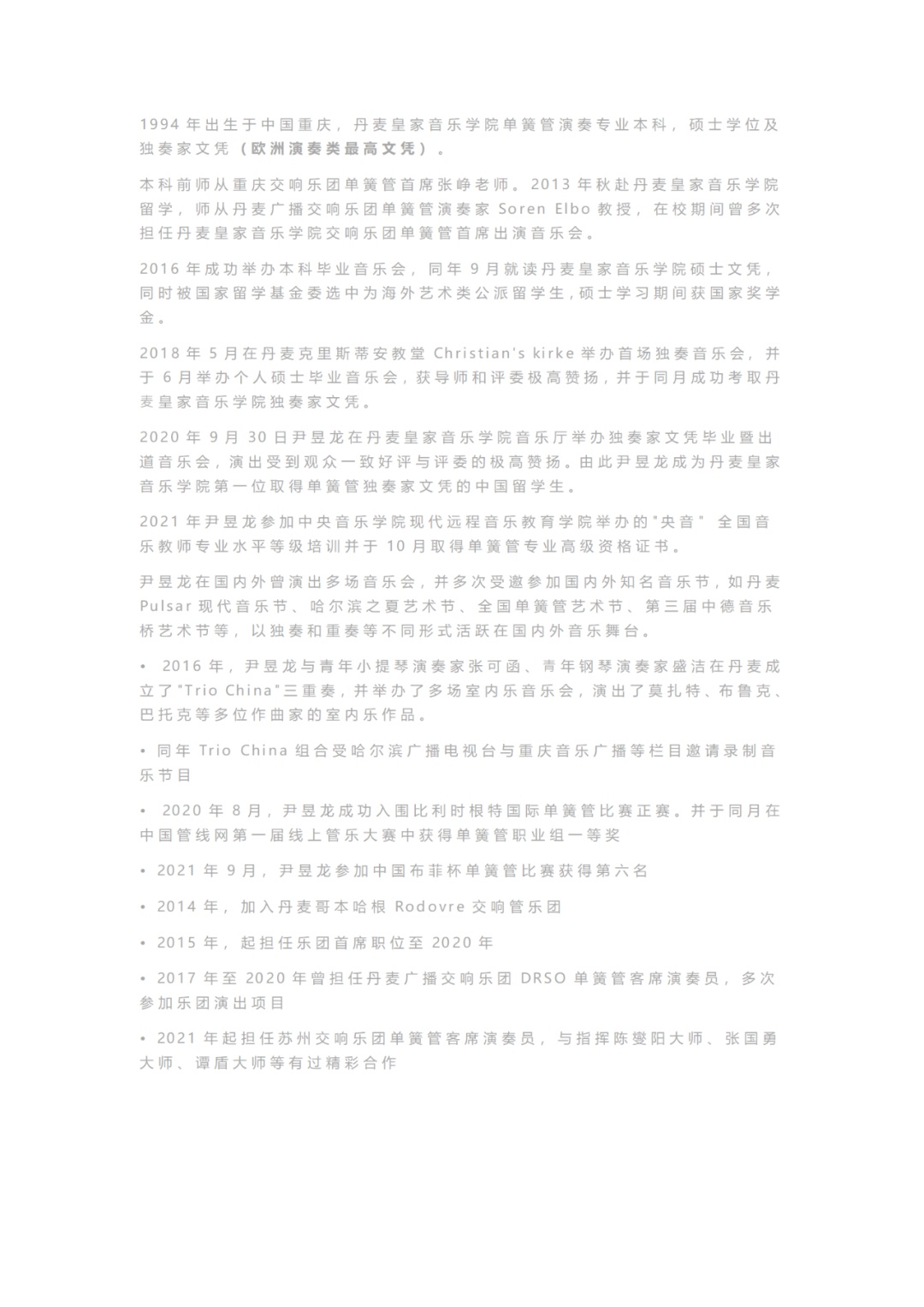 丹⻨皇家音乐学院单簧管独奏家尹昱龙