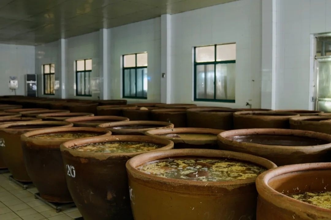 走进金山酱菜厂,工人们正在忙着切菜、二次加工等操作。一排排深褐色的酱缸排列开来,里面是正在腌制中的酱菜,有黄瓜、蒜瓣、生姜等多个品种。