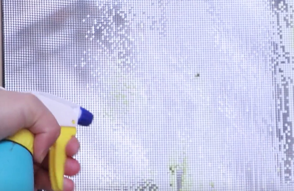随后直接将调好的溶液喷洒上去,大家可以看到在喷洒过程中,上面一些灰尘已经形成水滴滴落下来了,如果说加重纱窗的比较脏,我们可以选择将这个溶液多喷洒一点,让它静置几分钟哦。