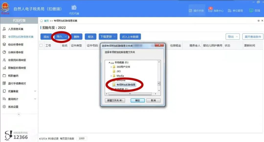 第二步:点击【导入】,将提前收集好的专项附加扣除信息表放入对应文件夹中。