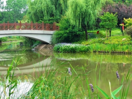 绿带沿岸的水生植物及挺水植物不仅丰富了外环绿带水体的色彩,也柔和了驳岸线,让这里形成韵致无穷的倒影景观。