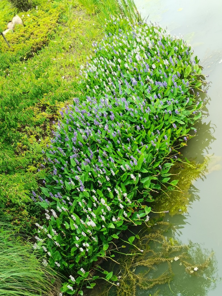 被称为水上薰衣草的梭鱼草静静地挺立在夏日的水中,叶色翠绿,花色迷人,一片清新。
