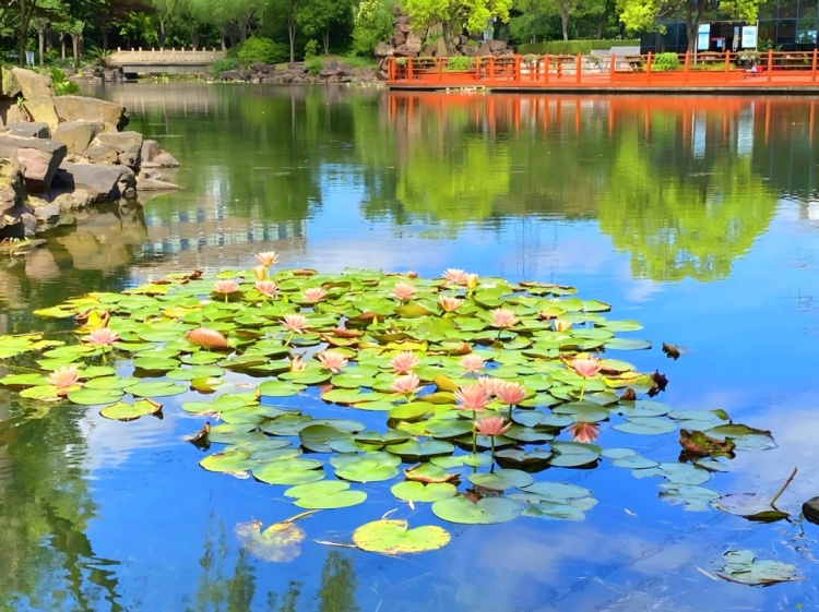 在池中央,睡莲从水面浅浅地探出头来,被漂浮在水面的绿叶簇拥着悠扬自在地绽放。