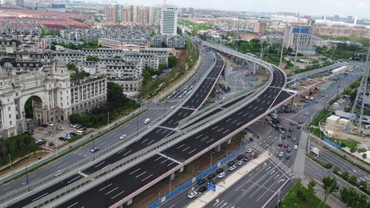 据隧道股份市政集团项目部介绍,该工程在保留一部分原立交系统情况下,在金海路立交区域内增加两条匝道线与主线合并,形成两进两出双“人”字形高架系统,自下而上进行多维度空间化改造。工程建成后,将极大缓解该路段因车流量大、上下班高峰造成的拥堵。