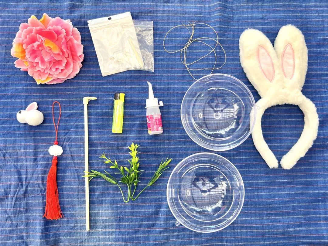 制作材料:圆球、仿真花朵、仿真叶子、毛绒玉兔、兔子发箍、吊穗、金丝线、手提杆、珠子、胶水