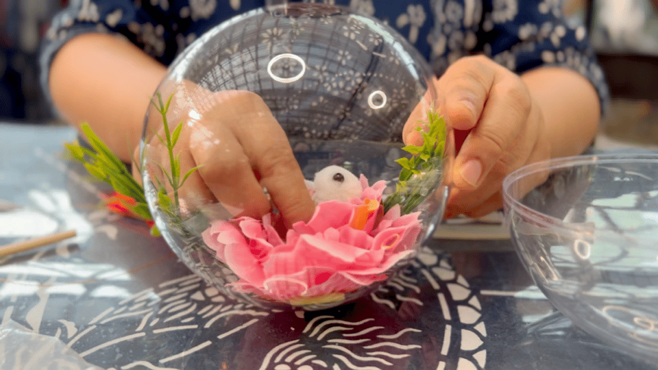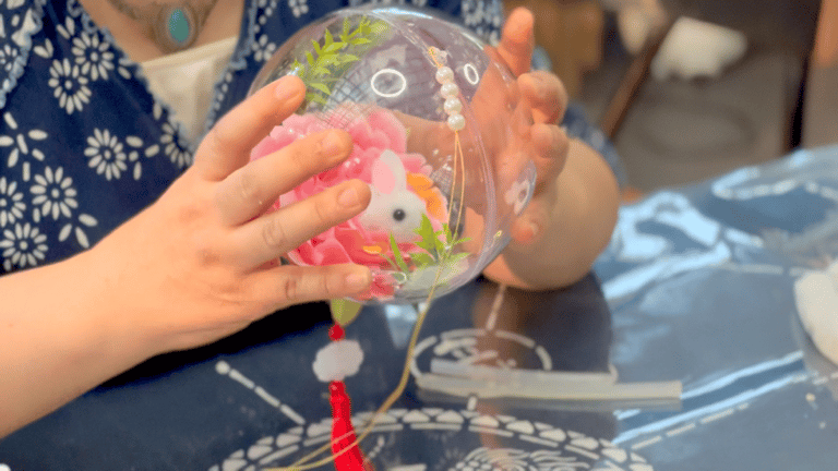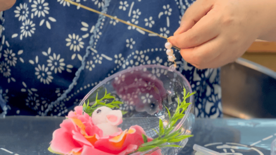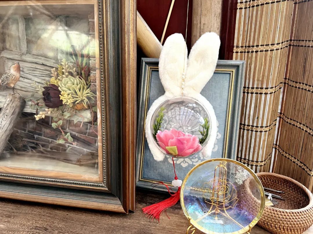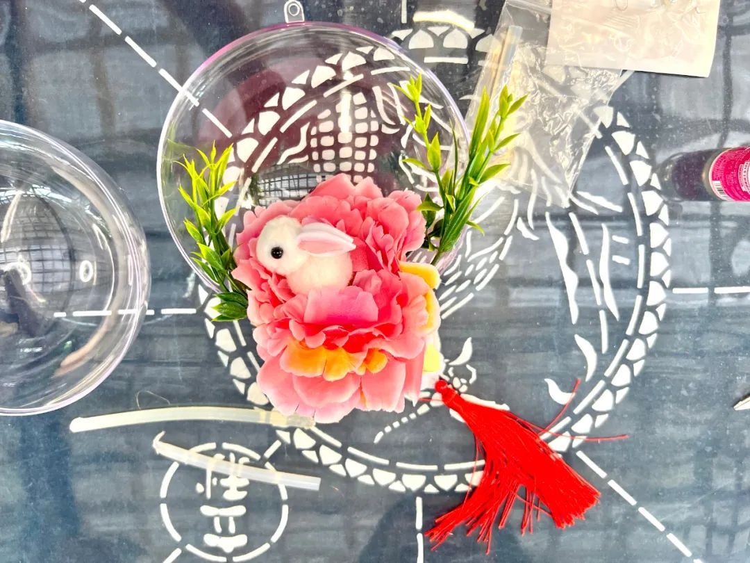 1、将仿真花朵、叶子、玉兔黏贴在圆球中线位置