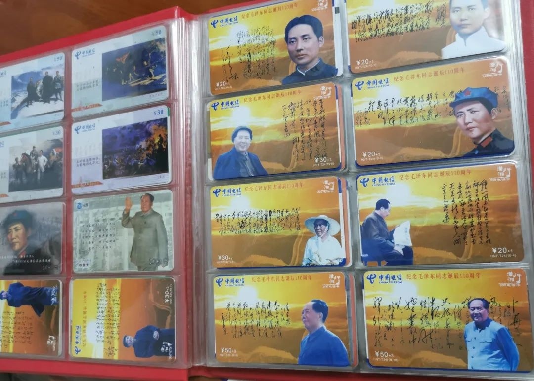 黄建平表示,自己最喜欢的,还是红色主题的电话卡。“为了保持这套卡的完整性,我买回来后就一直珍藏,都不舍得刮开密码使用里面的话费。”黄建平指着“纪念毛泽东同志诞辰110周年”系列电话卡说。黄建平为自己精心收藏的这套电话卡感到自豪和骄傲,因为这一张张的“红色”电话卡,是另一种形式的党史教科书,记载了中国共产党的光辉岁月与辉煌成就。
