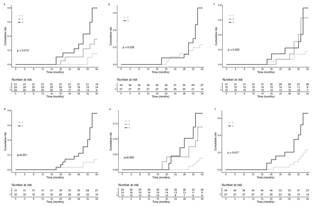 最后,使用时间依赖的受试者工作特征(Receiver operating characteristic, ROC)曲线下面积(area under the curve, AUC)来评估上述模型的准确度,结果表明,自研究开始至24月、28月和32月,AUC分别为0.78、0.80和0.78,在第35月,模型的准确度达到最高,AUC为0.83。