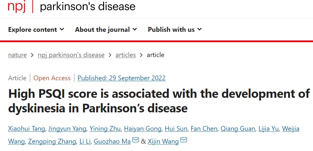 近日,同济大学附属同济医院神经内科汪锡金教授在Nature 合作期刊npj Parkinson’s Disease杂志在线发表最新研究成果“High PSQI score is associated with the development of dyskinesia in Parkinson’s disease”,提出睡眠障碍(Pittsburgh Sleep Quality Index, PSQI≥6)是帕金森病(Parkinson’s Disease, PD)患者发生异动症(dyskinesia)的独立危险因素,并构建异动症的预测模型,该模型具有很高的准确性。通过对睡眠障碍与异动症相关性的研究,为异动症发生机制的研究及防治提供新的研究方向。