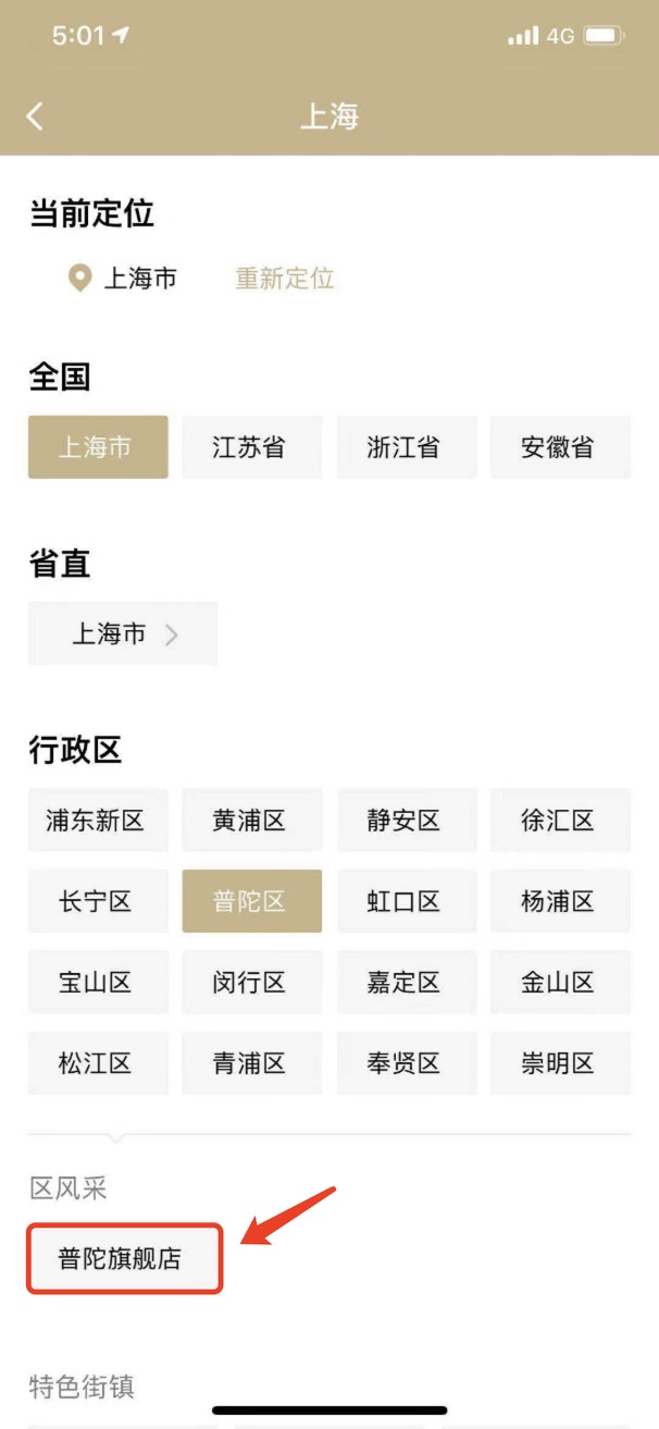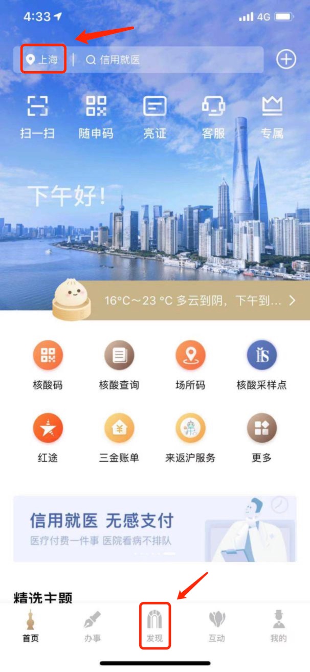 进入【随申办市民云】,选择“发现”频道,点击左上角“上海”,选择“普陀旗舰店”。