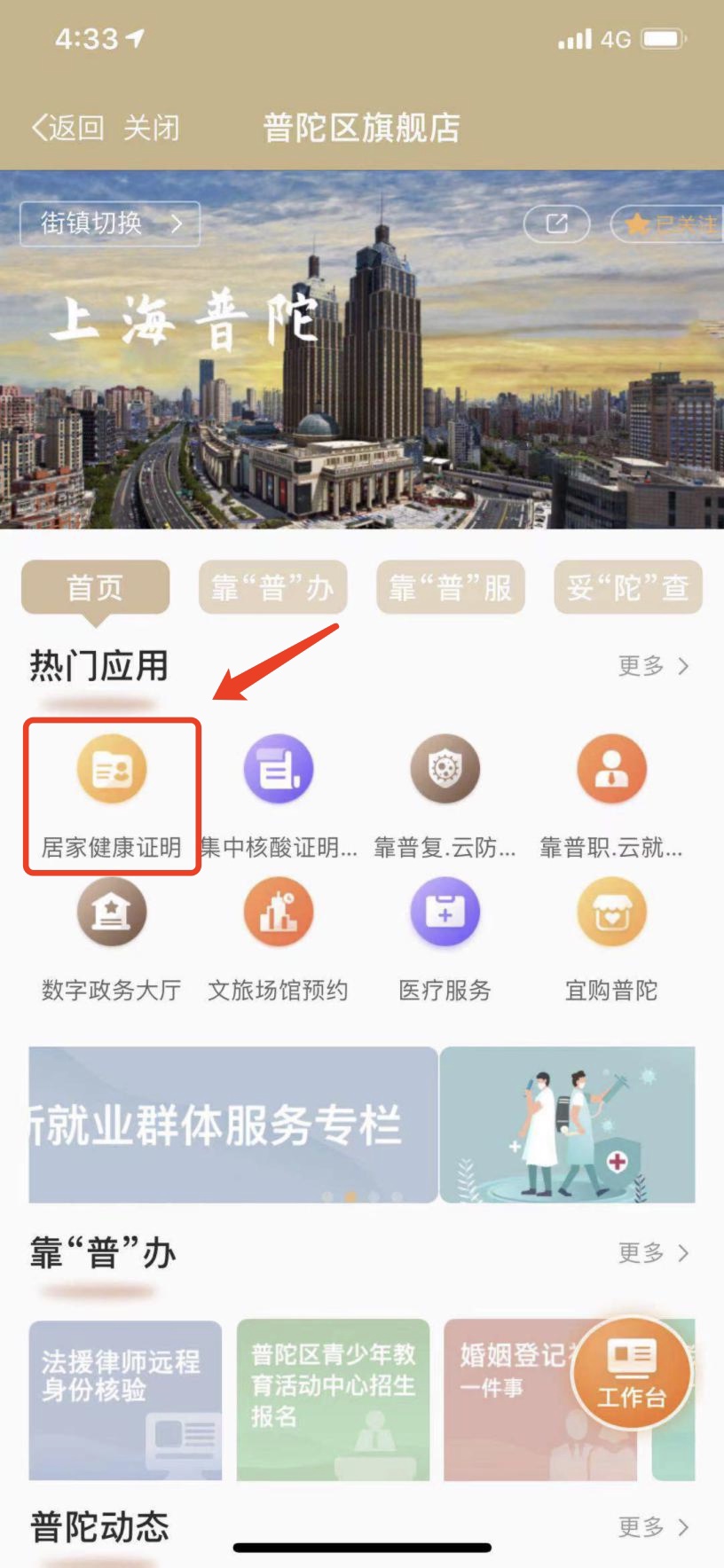 在“普陀区旗舰店”首页,“掌上办事”栏目中,选择“居家健康证明”服务,点击便可使用。
