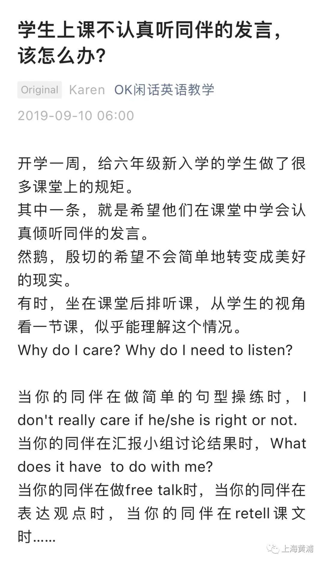 刘歆蕾老师说:“我的师傅李老师是一位研究型的教师。她会把教学中的感悟和反思撰写成教学随笔,发表在她的教学微信公众号上。她所写的内容涵盖了教学的方方面面,有教案的撰写、目标的制定、提高活动实施的有效性、课堂提问等等。我在见习期经常阅读李老师的公众号,帮助我尽快地站稳讲台,上好每一节家常课。印象最深的是,作为新老师,我发现学生在课堂中不善于倾听同学的发言,这个让我很苦恼。当时李老师正好写了一篇推文,介绍如何通过活动的设计,引入学生提问、教师追问、设计学习单、改进教学活动等方式培养学生互相倾听的习惯。这篇文章融合了李老师自己的教学经验和实践,操作性很强,对我的教学提高带来了很大的帮助。”
