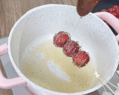 可以把稍稍冷却的糖浆淋在山楂上,操作更简单,还省糖。如果裹的过程中糖浆凝固了,可以继续小火加热。