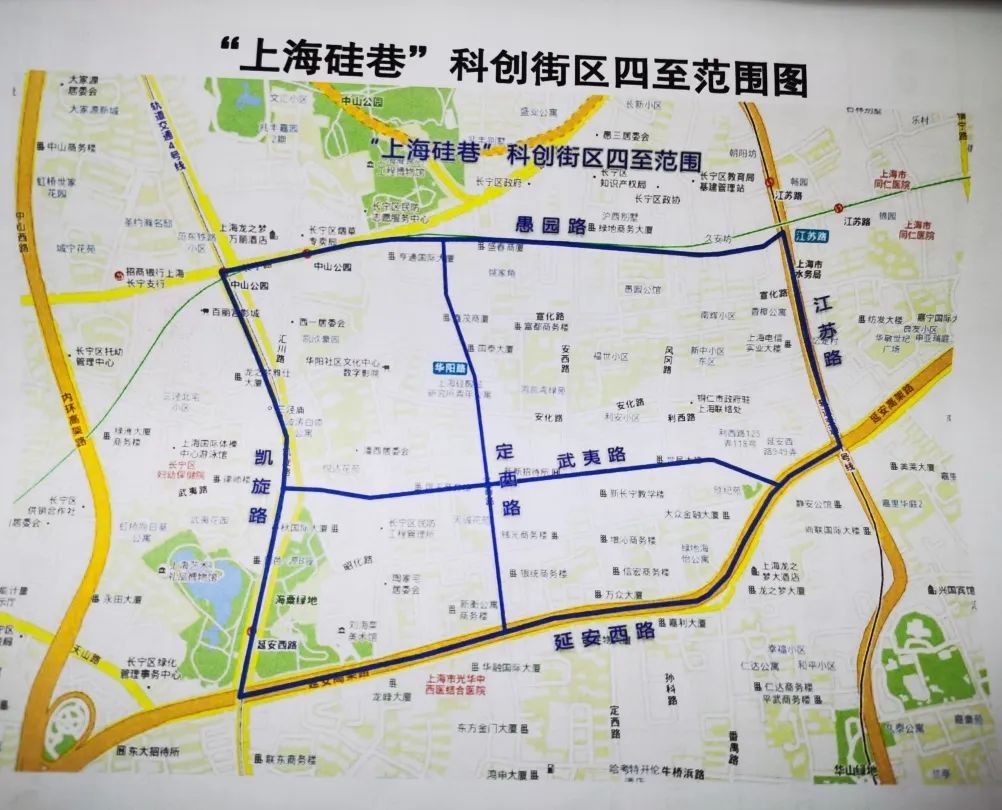 在“试点方案”中,长宁区“上海硅巷”科创街区整体呈现为“田字格”形状,东至江苏路沿线,南至延安西路沿线,西至凯旋路沿线,北至长宁路-愚园路沿线,中间沿武夷路、定西路为十字支撑,将打造为一站式新双创街区。