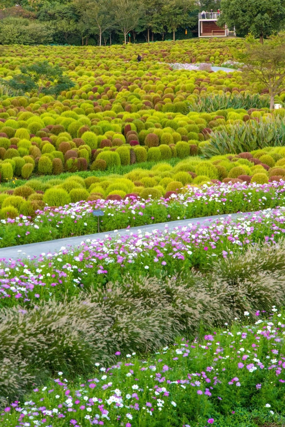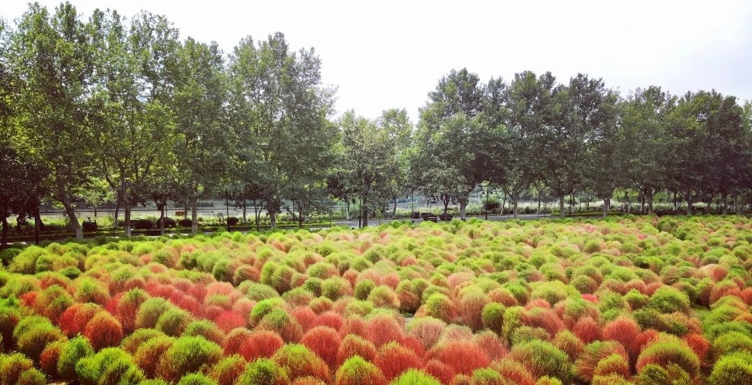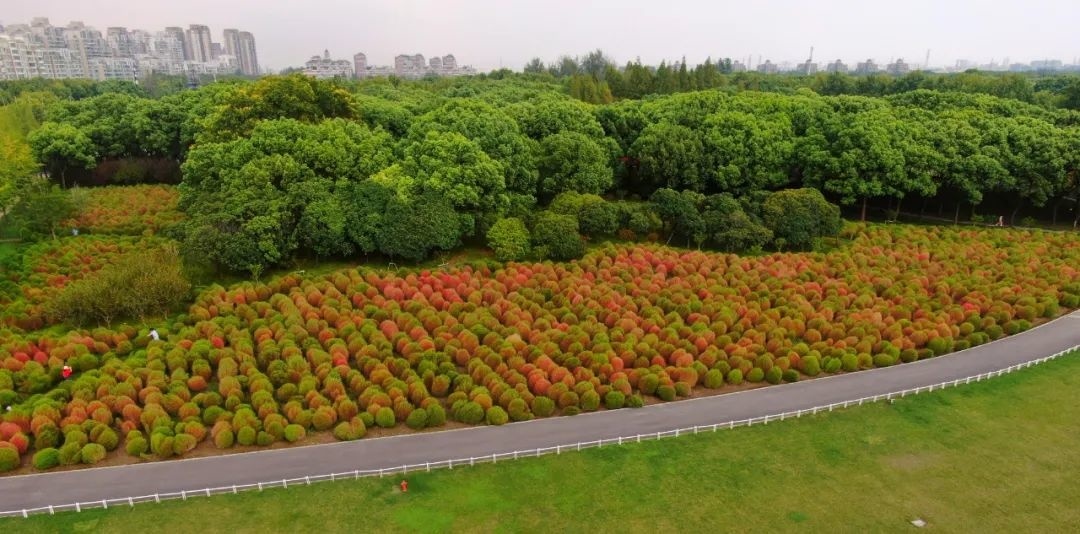 位于世纪公园乡土田园区20000平方米红叶地肤进入了“换装”期。个别植株呈红变紫,夹在多数嫩绿植株之中,与绿地蓝天相互映衬,画面色彩绚烂。伴随着秋天的脚步,天气也开始变凉,地肤的色彩也变得越来越美了,游客将观赏到“地肤”从绿变红,最后一片红褐色的壮观景象。