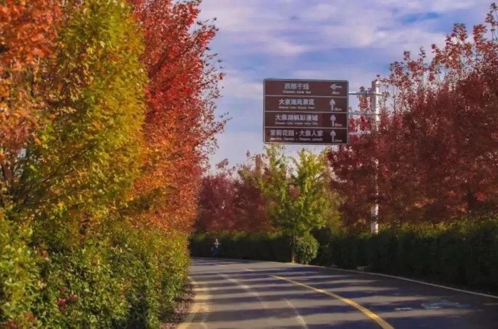 在竹镇的大泉湖周围有一条7.4公里长的环湖路,以红枫和红叶石榴为主的枫树连绵不绝,点缀着整条公路。秋意渐浓,从枝头到树腰的枫叶正渐渐披上红色的外衣,十分招人眼球,都把树下的绿色灌木丛变成了点缀。