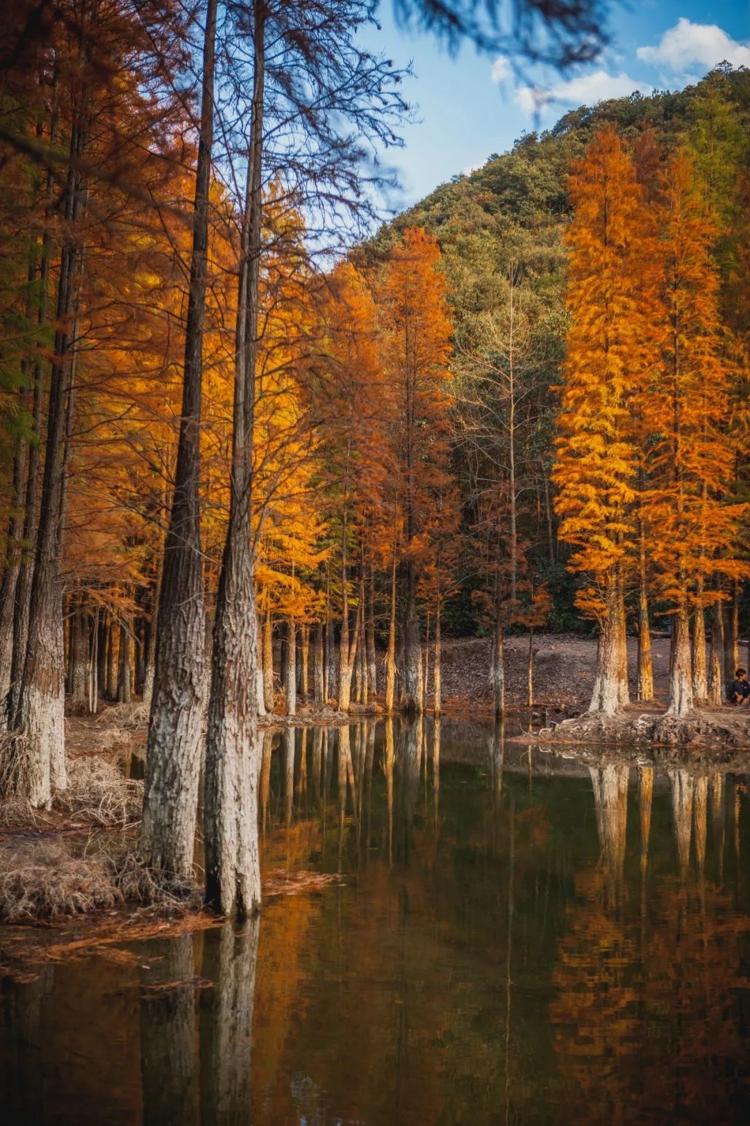 宿迁泗洪洪泽湖湿地占地面积300余亩的水杉林,每年10月、11月,红锈、橘黄、橘红等色彩便如同火焰般在林间蔓延,一不小心就美成了童话世界!