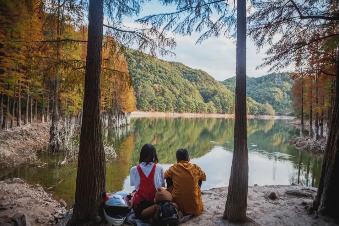 比起其他大名鼎鼎的水库湖泊,朝阳水库显得十分小众,虽然面积不大,但人少清幽。水杉林被绿水青山环绕,换成红色新衣裳,在水畔恬静如故,让这个秋日潋滟了一抹醉意。