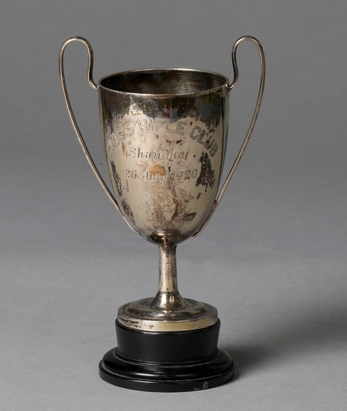 这组奖杯为20世纪二三十年代上海瑞士国洋枪打靶会射击比赛的银质奖杯。八件奖杯器型皆为典型的欧式奖杯式样,带有双耳,素面无纹,部分外壁錾刻铭文“Swiss Rifle Club”。奖杯原盒包装印有公司名ZEE SUNG&CO,公司营业范围Watch Maker,Gold and silver smith,以及公司地址等信息。