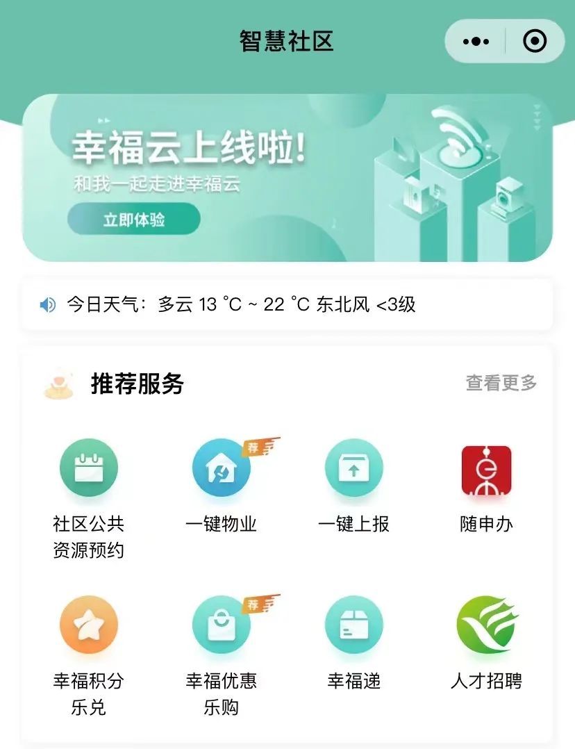 “幸福云”是为居民提供多元化的一站式社区服务系统,为社区治理提高幸福指数。据淀湖居委会工作人员介绍,虽然目前处于居民注册阶段,但进入小程序就能看到几大板块,比如社会公共资源预约、一键物业、一键上报、人才招聘等生活服务,也有对接随申办系统,还有优惠乐购及积分兑换等优惠便民服务。如若居民发现社区内或周边存在违建等情况,可以通过在线上报给居委会,“幸福云”真正有效地打通了为民服务的“最后一公里”。