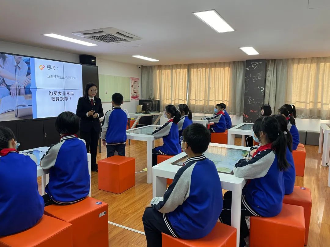 据了解,2022“百校百讲普法行”虹口专场在全区6所学校开展。为了深入落实“八五”普法规划要求,打造更具教育效果和法治温度的课程,虹口区人民法院联合区教育局积极探索将安全教育和法治宣传融为一体,借助“沉浸式体验+普法讲座”的创新形式,让学生全方位认知学习禁毒和交通安全知识,帮助孩子们扣好“人生第一粒扣子”。