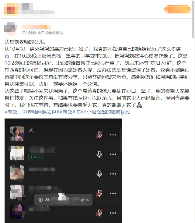 11月2日凌晨,一名网友在微博发文称,自己是刘老师的女儿,刘老师自10月初至死亡前,给学生上网课时多次遭到网暴。